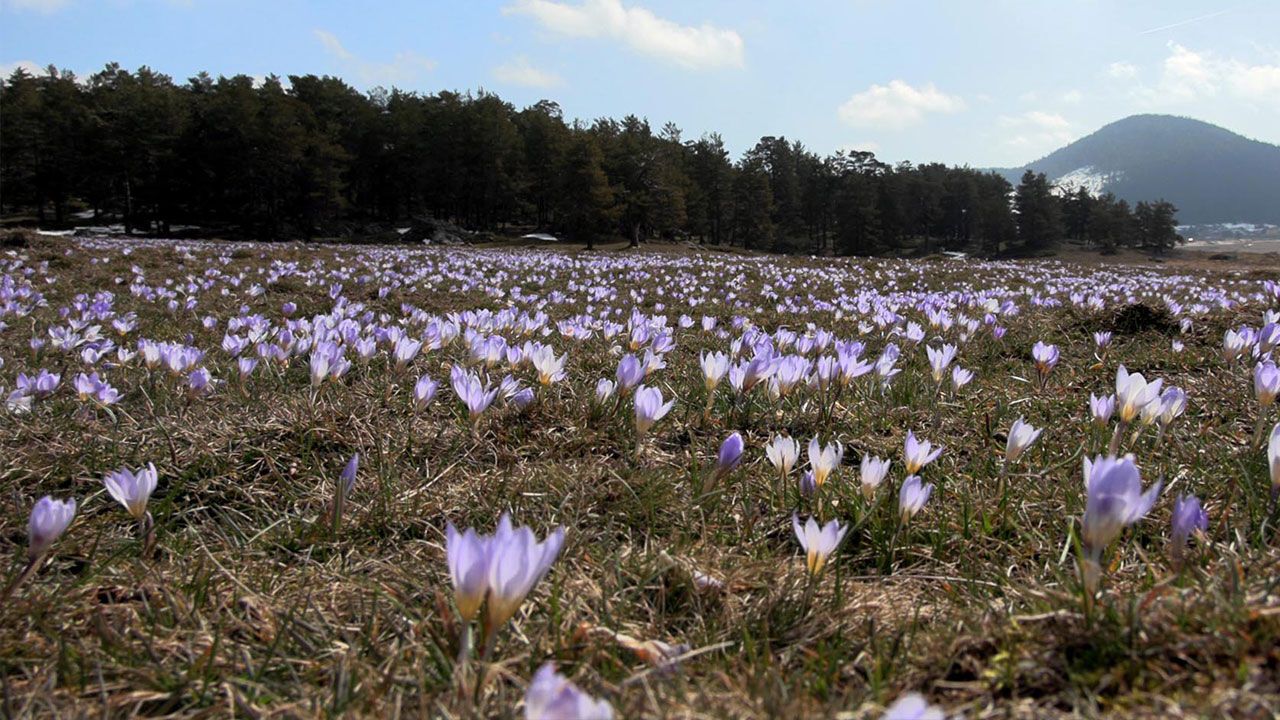 Köroğlu Dağları’nın eteklerinde yer alan yaylaya, mavi çiçekler ile yeşil alanların üzerini kaplayan çiğdem çiçekleri renk kattı. Sarıalan Yaylası’nda meraların içerisinden süzülen mendereslerin çevresinde açan çiğdem çiçekleri ile bazı bölgelerde erimeyen karların buluşması eşsiz manzara oluşturdu.